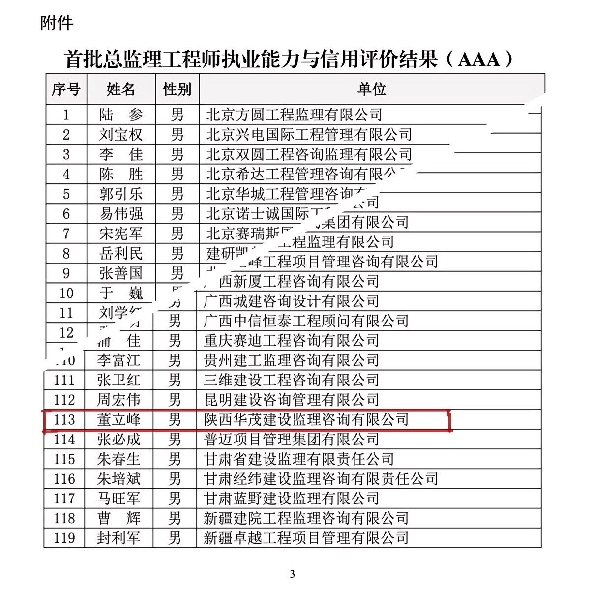 此次评价由中国建设监理协会统一组织,经地方协会/分会推荐和资料复核,于11月由中国建设监理协会组织专家对符合要求的总监理工程师进行现场答辩及考核;首批有174人获得评级,其中陕西省仅2人获评AAA级,董立峰即为其中之一。